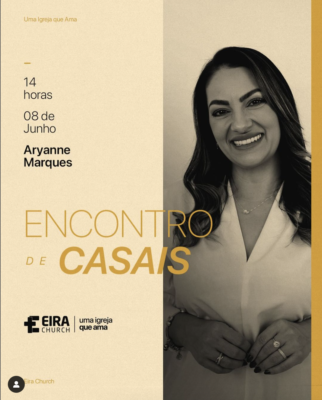 A nossa querida Aryanne Marques estará na @eirachurch no dia 08, ministrando o “Sexualidade Plena Experience”, um evento com MUITOS ensinamentos para você, que deseja aprender e desfrutar de um relacionamento feliz em TODAS as áreas!